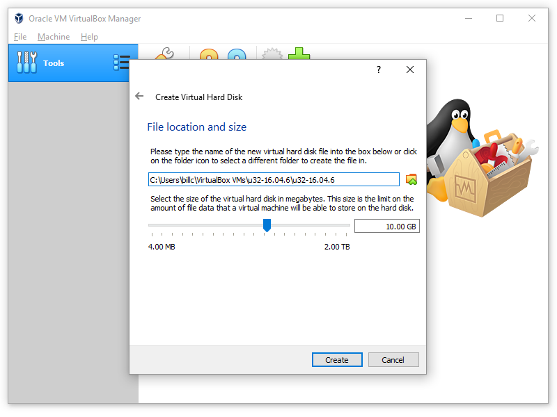 u32-16.04.7" in the Name textbox (to mean "ubuntu", "32-bit", "version 16.04", and "release 6"). (Please ignore my typo! Instead of "u32", I have "u34" in all the screenshots! Also, if you are installing version